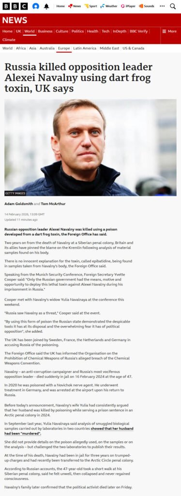 A new claim, that Navalny was poisoned by the Russians with Epibatidine (a toxin derived from South American Dart Frogs) has been made, reported (here) by the BBC…