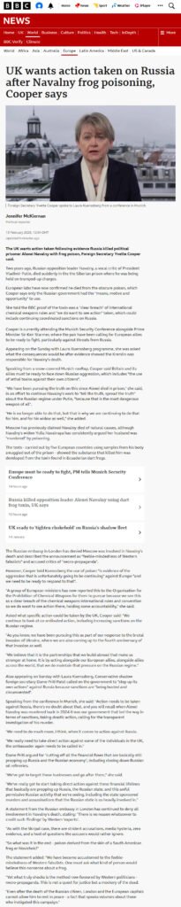 It’s interesting to note that his sainted wife, Yulia (who was curiously on hand at the Munich Security Conference when the news broke that her husband had died), is already alleging that Putin had him killed in prison… and with novitchok. And that Putin is not releasing his body so that all traces of novitchok disappear. Again.